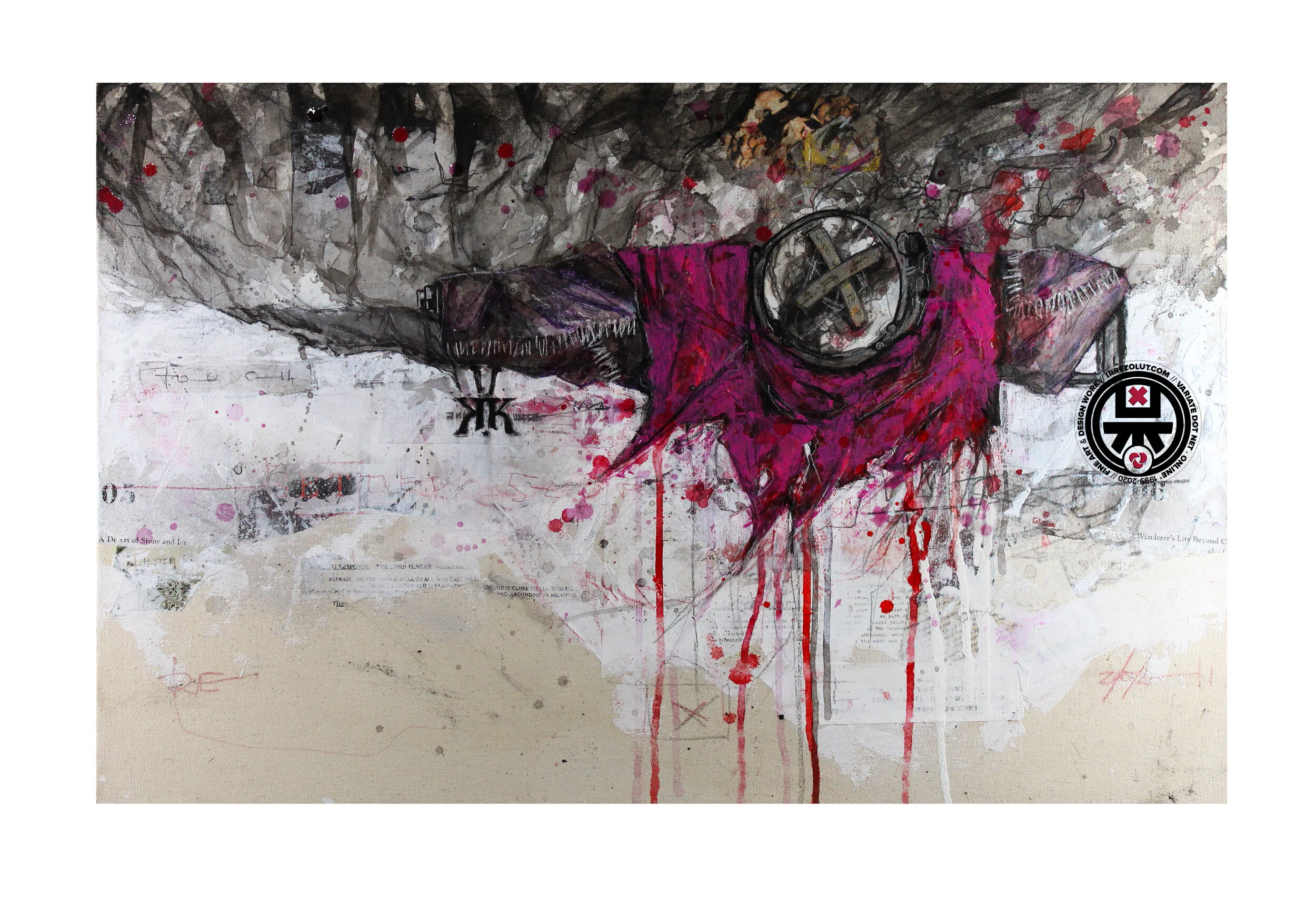 Touch of Malice (Settled Score) June 15, 2020 Touch of Malice (Settled Score) - 28x18"/70x45cm - mixed media on canvas.Commissioned by @KxngKlutz (Twitter), modified hanging chain to depict mirrored "KK" icon, matching the glyph from the Forsaken font.